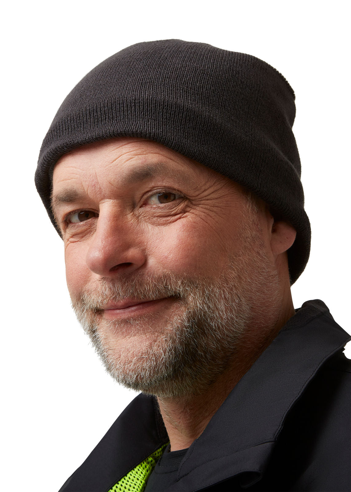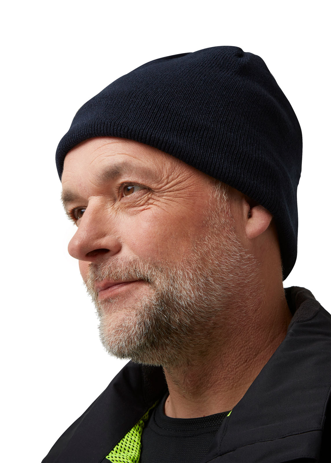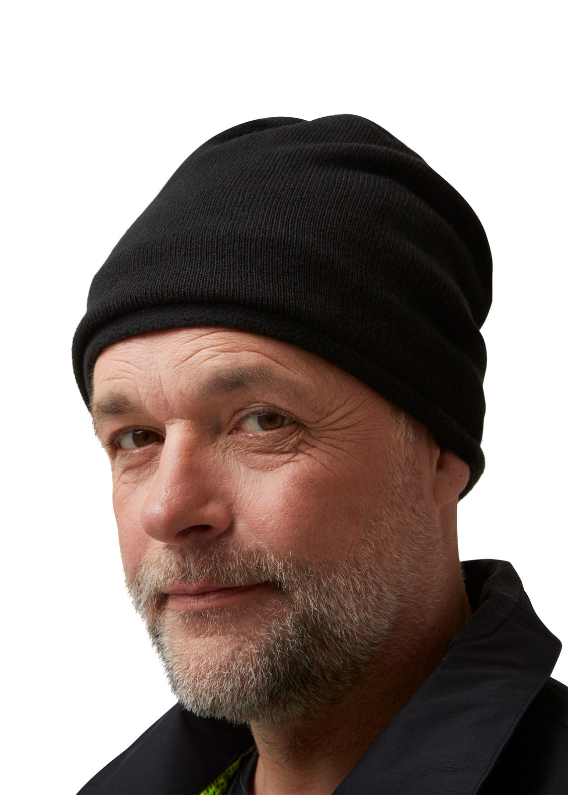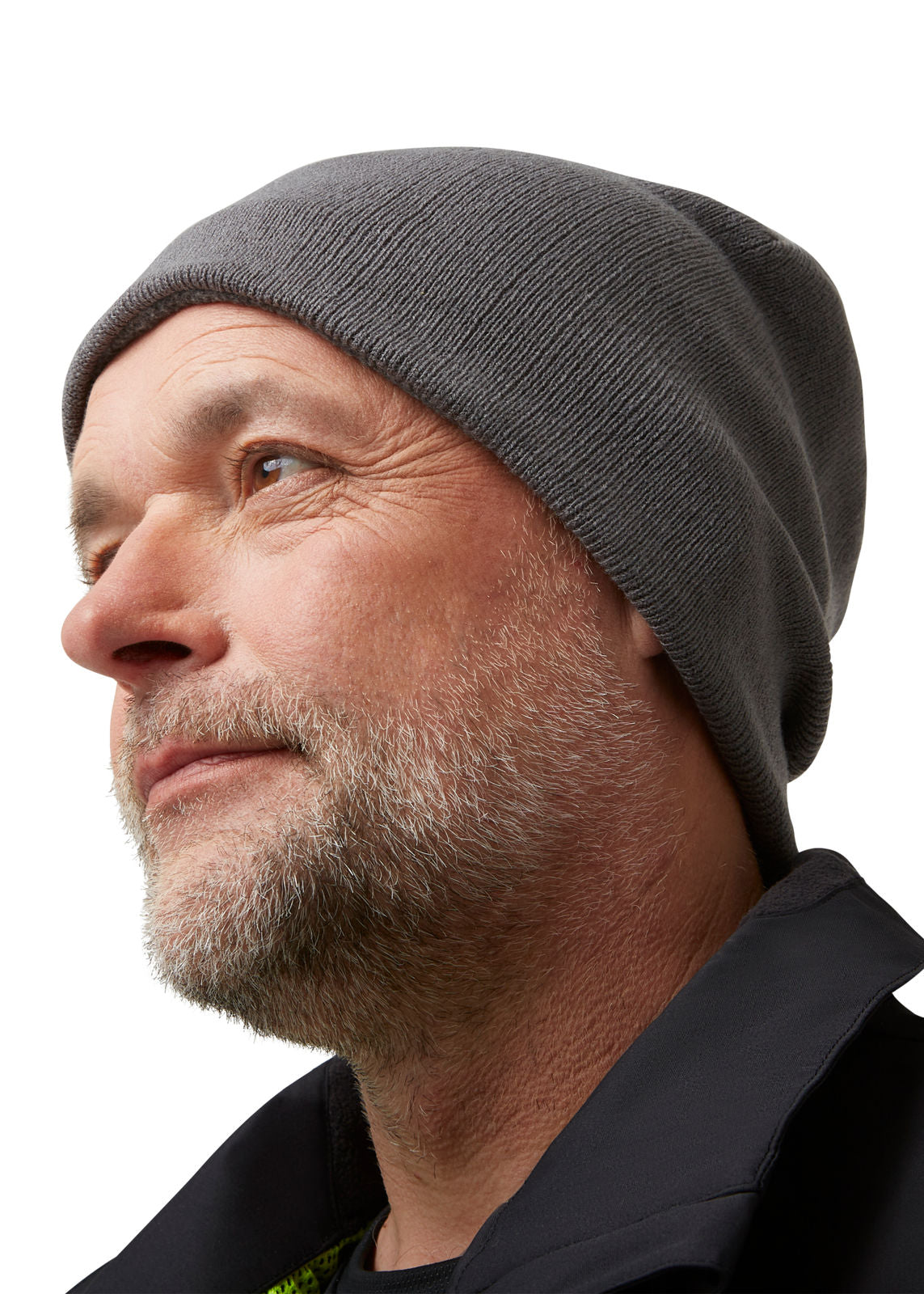 Die zweilagige, wärmende Rollmütze in Feinstrick-Optik bietet einen