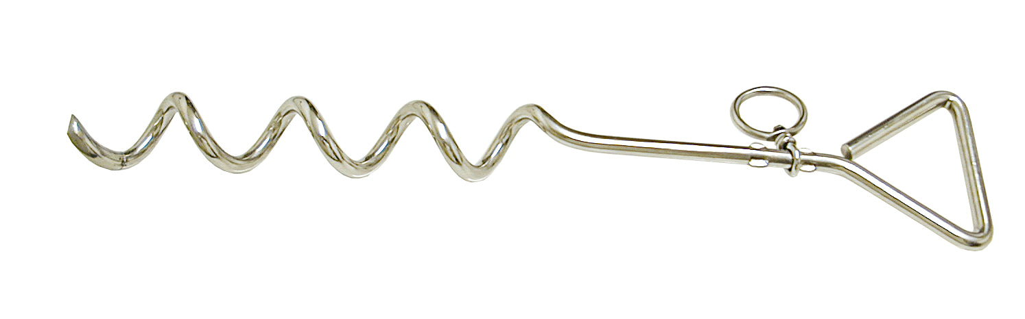 Erdbohranker aus Edelstahl. Der Erdbohranker kann wie ein Korkenzieher in den Erdboden gedreht und am Auge belegt werden. Nach der Nutzung einfach wieder heraus drehen.