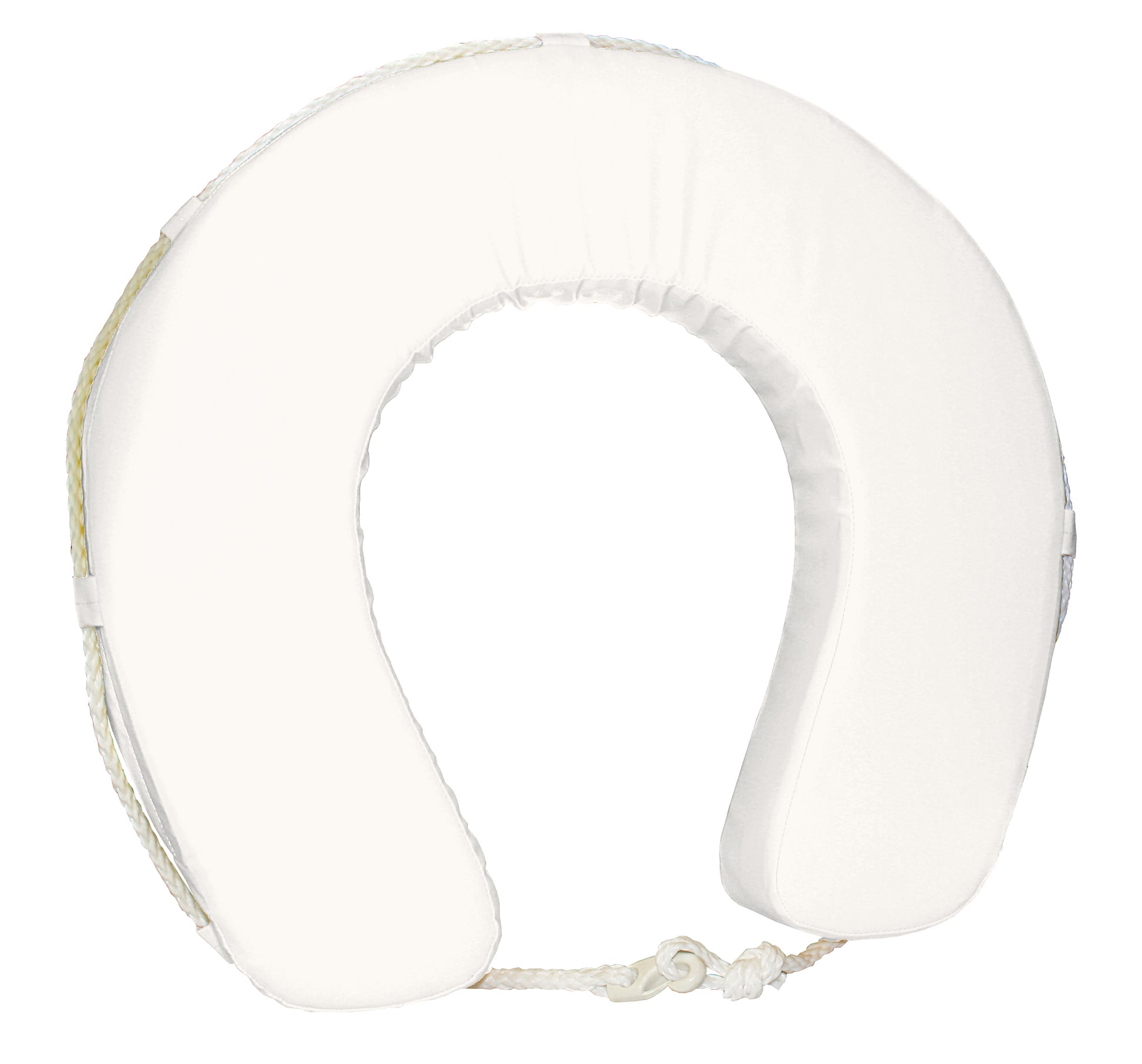 Hufeisen Rettungsring aus PVC. Schutzhülle mit Reißverschluss. Widerstandsfähig gegenüber UV-Strahlung. Ausgestattet mit einer Umlaufenden Leine und Nylon Schnapphaken.
